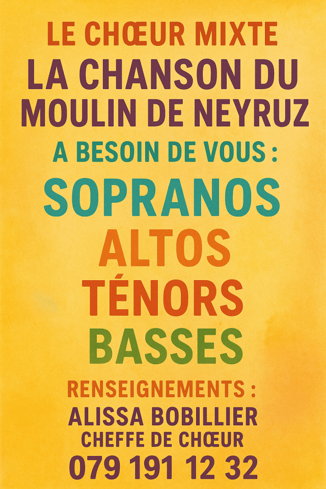 Depuis septembre 2025 c’est Alissa Bobillier qui est cheffe de chœur auprès de la Chanson du Moulin.